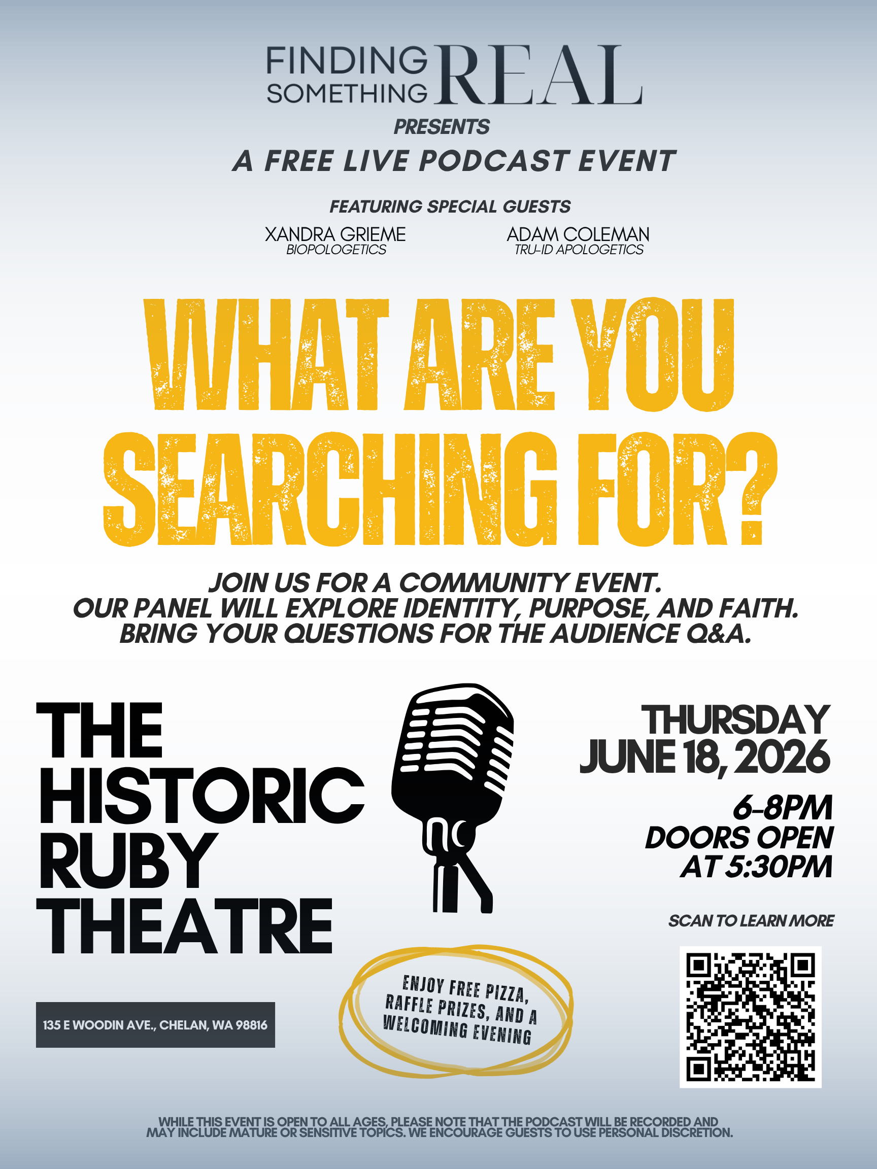 We are hosting our FIRST in-person live podcast recording and we’d love for you to be there! This event will be open to the public and free tickets will be given away first come, first served, at the door. We will also be giving away free pizza and soda while supplies last. The format of the evening will include a brief intro to the podcast, an introduction to our guest speakers and some members of the current FSR cohort, a panel discussion about identity, purpose, and faith, followed by an audience Q & A time.